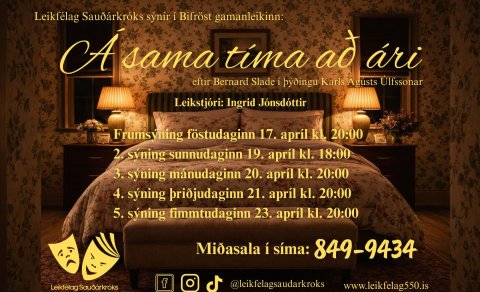 Leikfélag Sauðárkróks setur nú upp gamanleikinn Á sama tíma að ári sem frumsýndur var á Stóra sviði Borgarleikhússins 2012. Leikritið sló rækilega í gegn en verkið hafði þá notið mikilla vinsælda um allan heim frá því það var frumflutt í New York 1975.